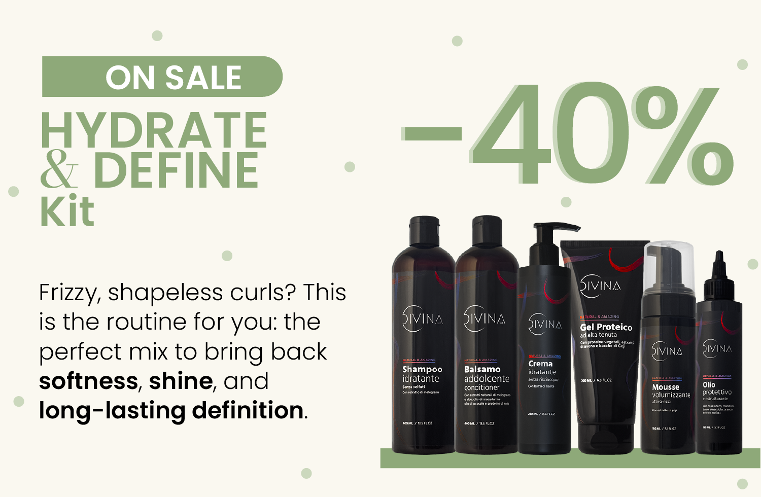 In one kit, all the products you need to create a simple and effective curly routine during your wash day – now 40% off! A perfect mix to give your curls extra hydration and shine, creating a voluminous and defined styling even in the days after washing.